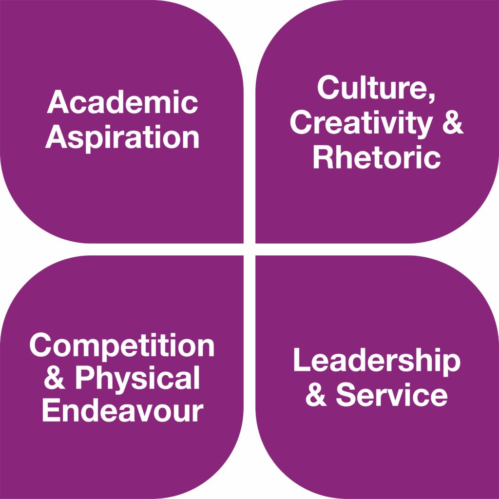 The Four Cornerstones are: Academic Aspiration, Culture, Creativity & Rhetoric, Competition & Physical Endeavour and Leadership & Service.