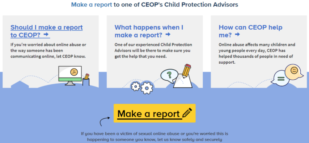 Parents, carers and children can report a concern about child sexual abuse or online exploitation to the CEOP Safety Centre.